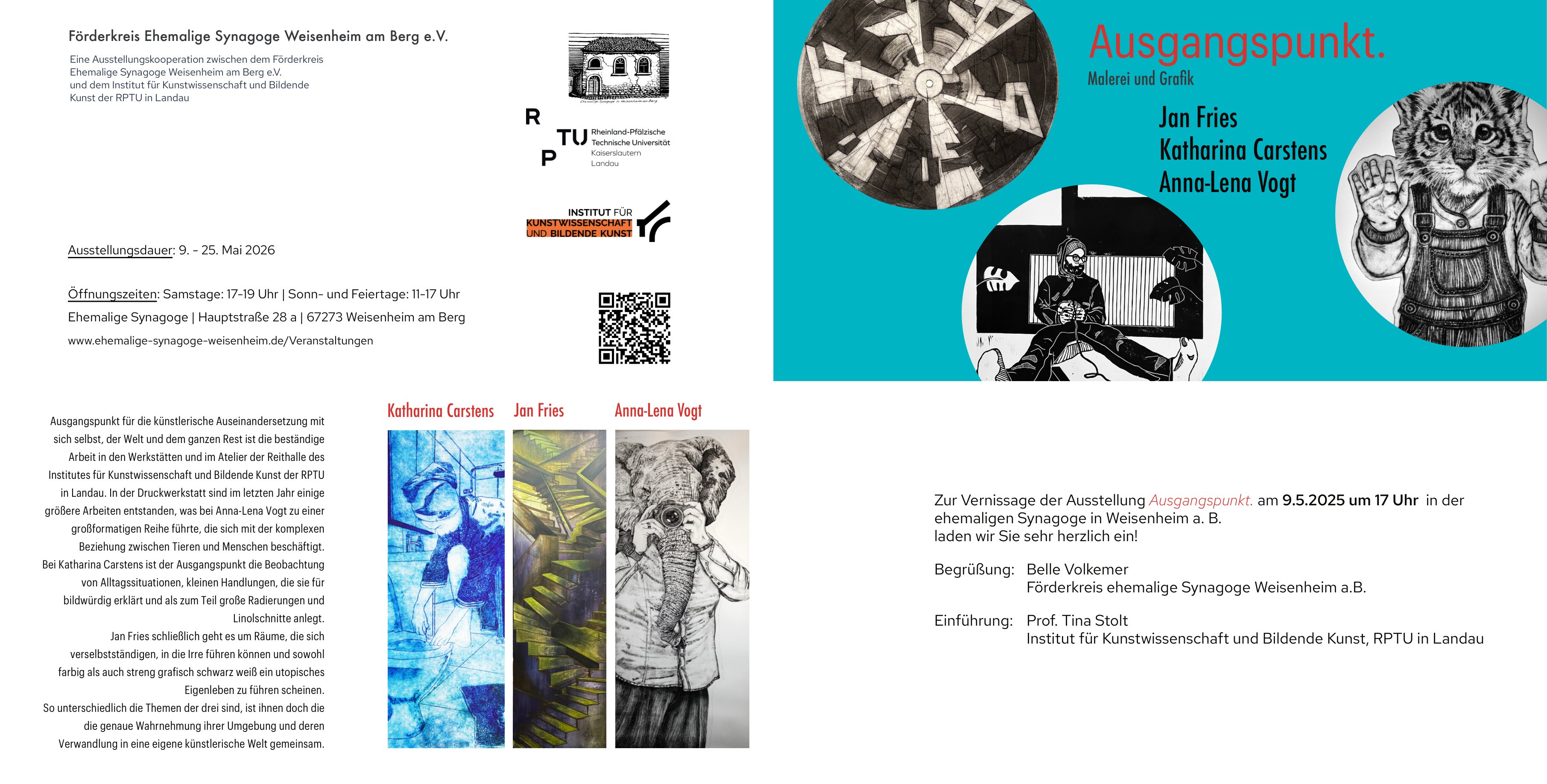 Sa. 9. Mai - | Ausstellung in Kooperation mit der RPTU in Landau: "Ausgangspunkt. Verschiedene Blicke in die Welt" - Katharina Carstens, Druckgrafik, Jan Fries. Drucke und Malerei, Anna-Lena Vogt, Drucke und Zeichnungen, Einführung: Prof. Tina Stolt. Weitere Informationen finden Sie hier. Vernissage am 9. Mai, 17:00 Uhr | |