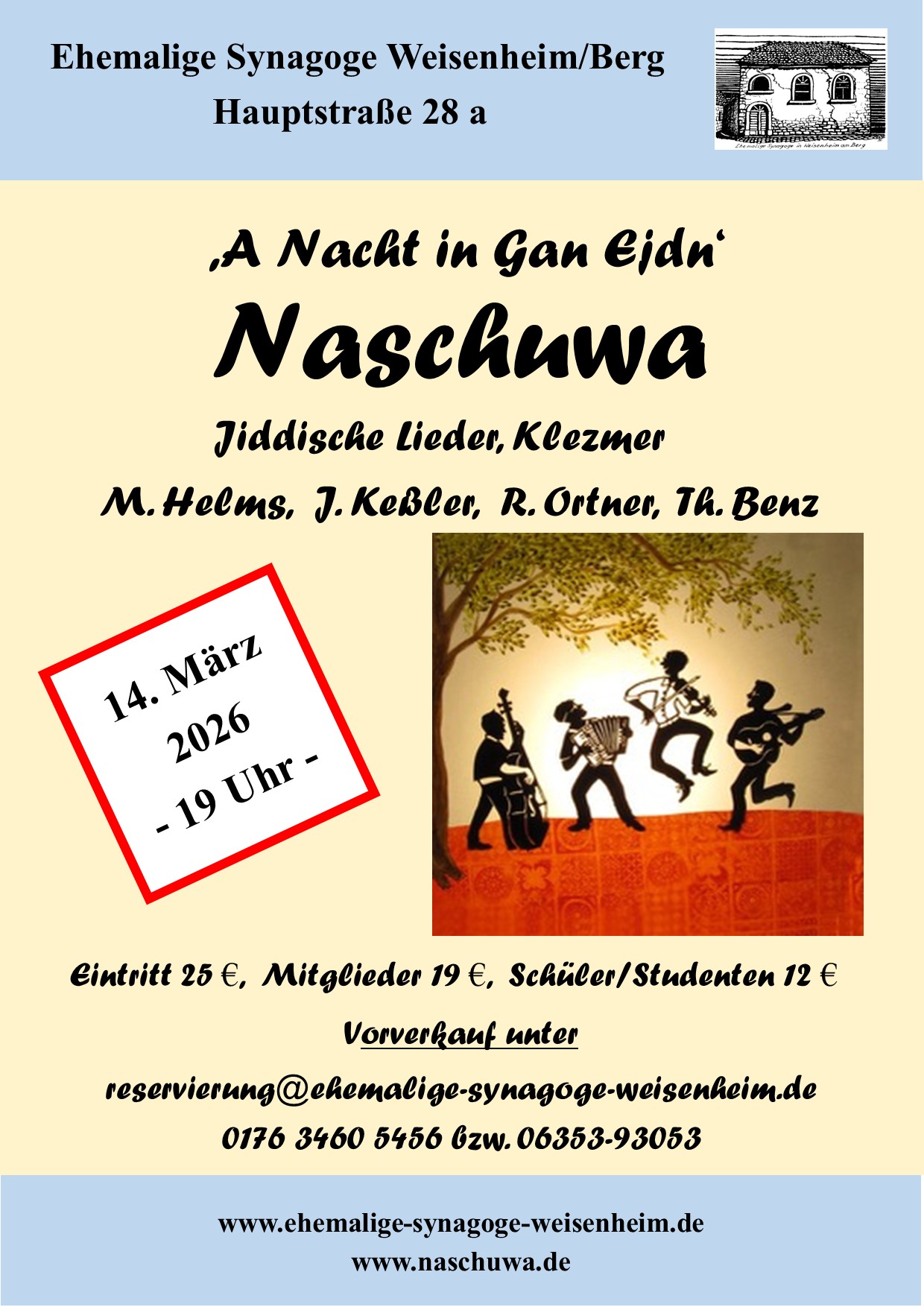 Sa. 14. März | 19:00 Uhr | Klezmerkonzert: "In Gan Ejdn" - Ensemble Naschuwa. Matthias Helms, Geige und Gesang, Julian Keßler, Gitarre, Rainer Ortner, Akkordeon, Thore Benz, Kontrabass |